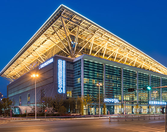 苏州国际博览中心地处苏州工业园区金鸡湖文化水廊北部,苏州国际博览中心展馆占地面积18.86万平方米,建筑规划总面积25.5万平方米。总体分二期建设。一期工程完成建筑面积18.5万平方米,其中展厅面积7万平方米,会议设施面积9500平方米,室外广场总面积3.5万平方米。